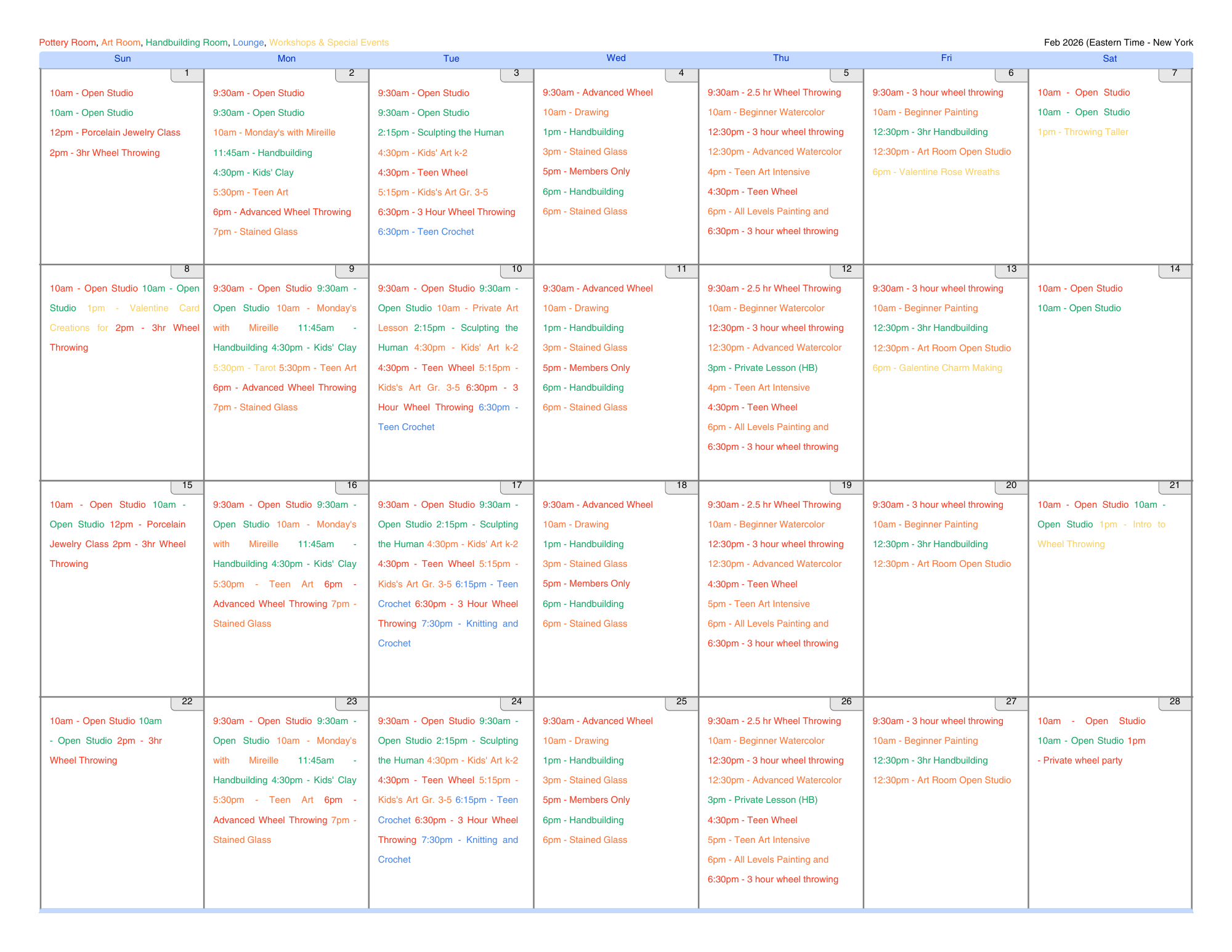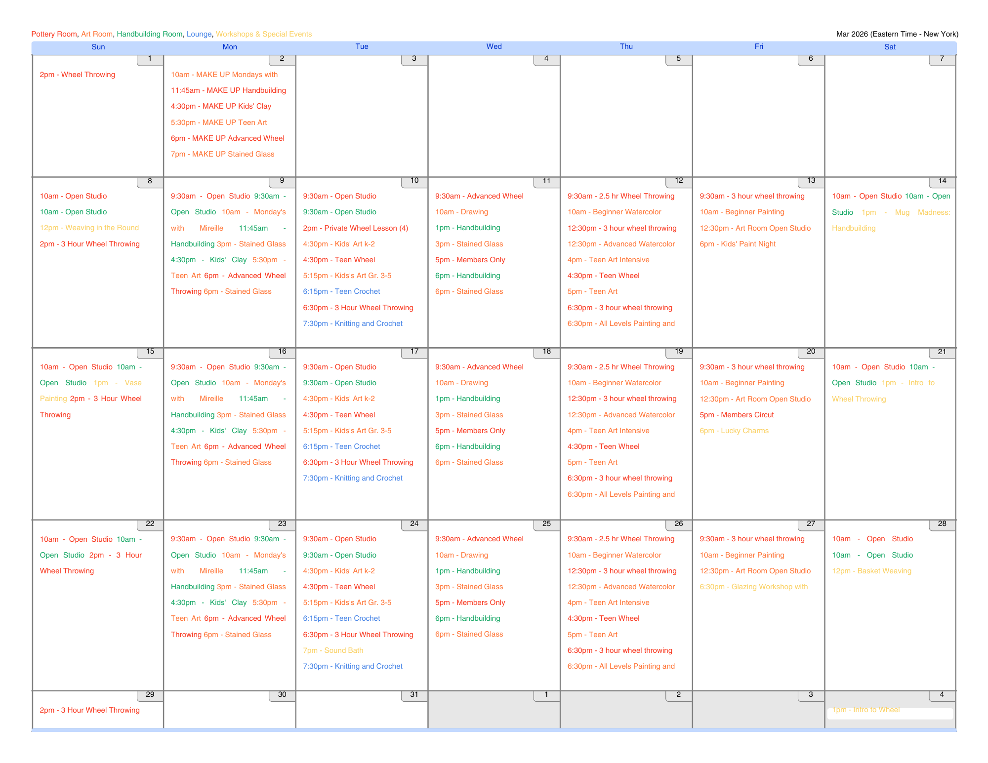 Calendar Please note that our interactive calendar is currently down! Please view PDFs and images of our calendar below! February 2026 Calendar March 2026 Calendar Click to view our General Class Schedule